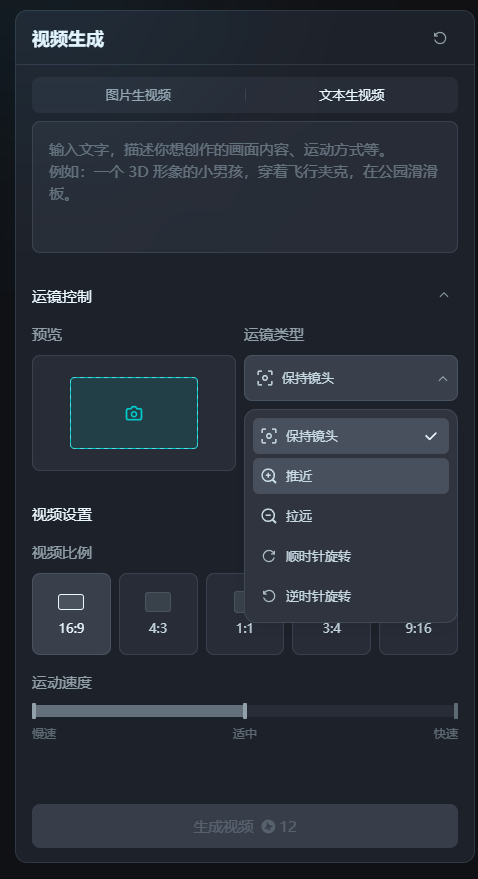 文生視頻支持正向提示詞、運(yùn)鏡控制、運(yùn)動(dòng)強(qiáng)度控制、幀數(shù)選擇,支持16:9、9:16、1:1、3:4、4:3尺寸,?