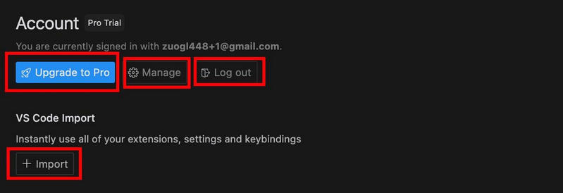 下方的VS Code Import 主要是用于將你之前的vscode的配置給導(dǎo)入進(jìn)來。由于這個(gè)操作會覆蓋你現(xiàn)有的cursor的插件和設(shè)置,且不可逆,不建議使用!前端老司機(jī)在安裝時(shí)就會選擇導(dǎo)入了,新手沒有vscode即使導(dǎo)入也沒東西,所以最好的做法就是不管他!