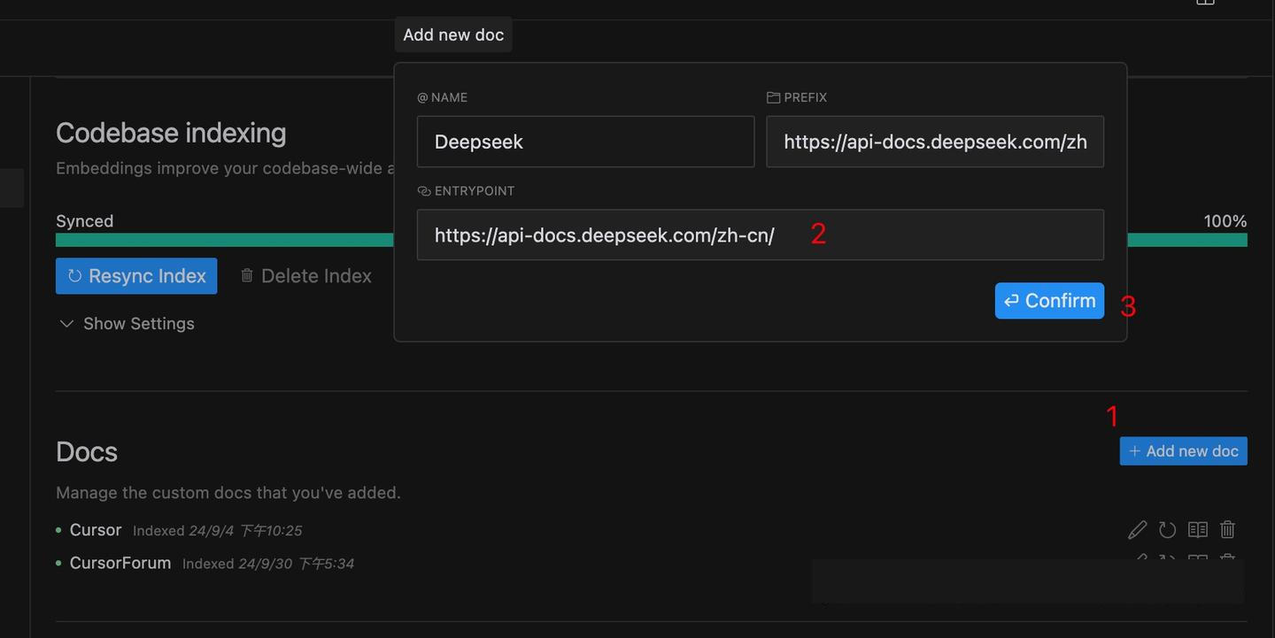 按照如下操作,先點(diǎn)擊Add new doc 開始添加一個(gè)新的文檔,然后將你要添加的文檔粘貼到2的位置并回車,Cursor會(huì)自動(dòng)解析你粘貼進(jìn)來的網(wǎng)址得到前綴和名字。然后點(diǎn)擊confirm完成添加。