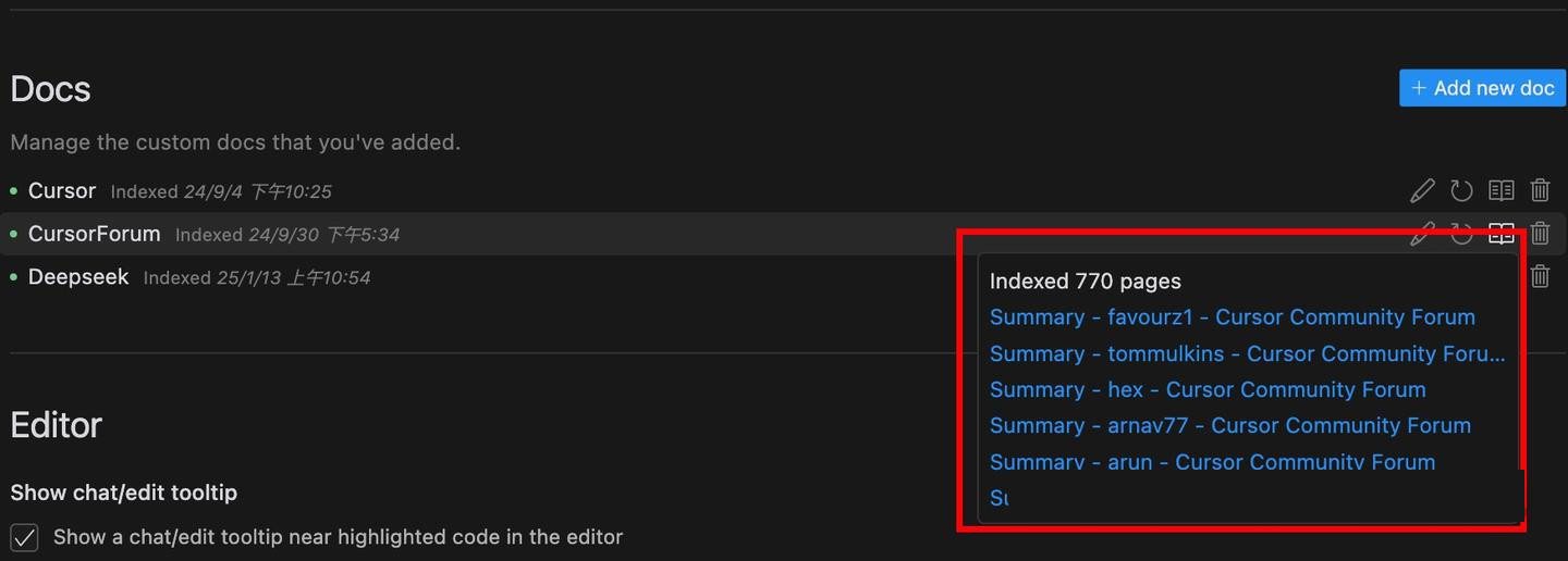 文檔添加完成后,點(diǎn)擊右側(cè)的小書圖標(biāo),即可顯示cursor索引了多少內(nèi)容。