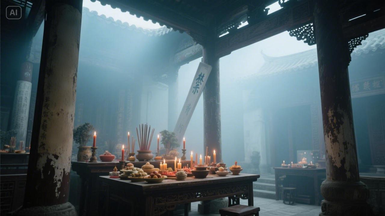中式夢核,祠堂供桌,低角度廣角透視,青灰色調(diào)晨霧彌漫,文字“禁”用斑駁毛筆字斜貼梁柱,暗光柔焦渲染