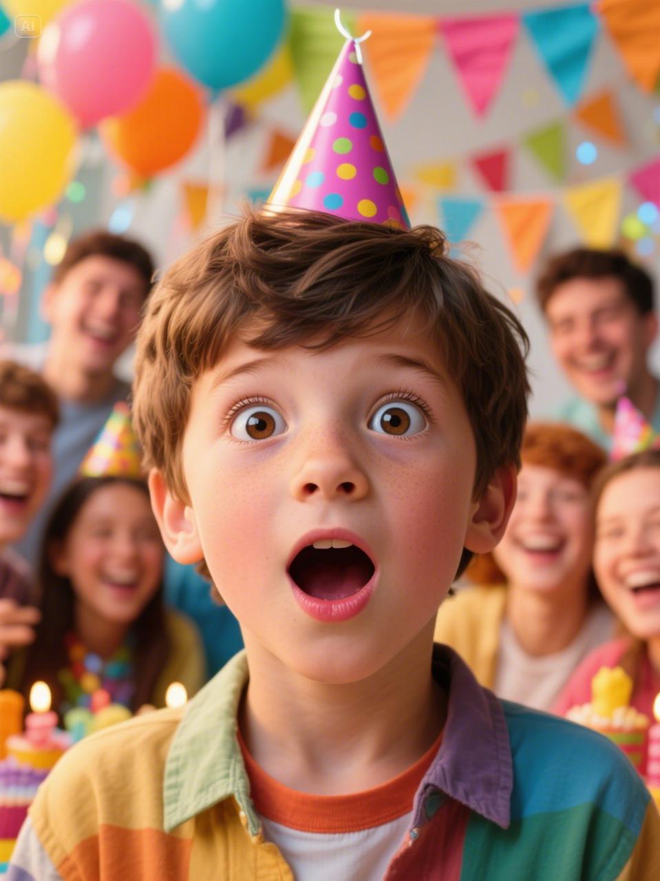 電影感, 一個男孩在生日派對上,特寫鏡頭捕捉他睜大的眼睛和張開的嘴巴,驚訝,背景是五彩的裝飾和朋友們的笑臉,暖色調,明亮光線。