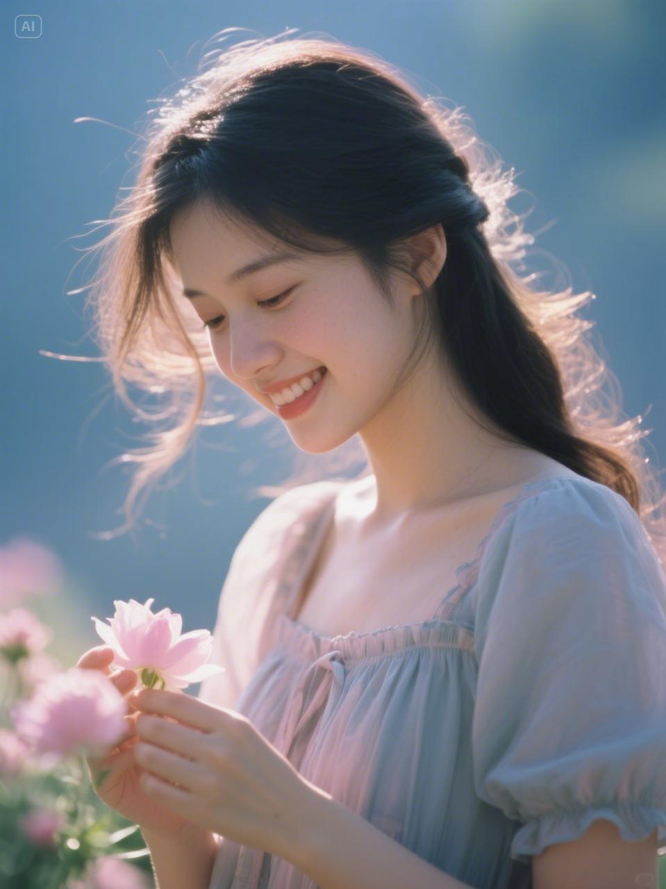 電影感,,愛情片,柔焦鏡頭,四分之三側(cè)近景,少女低頭微笑輕撫花瓣,夕陽(yáng)光穿過(guò)發(fā)絲形成輪廓光,粉藍(lán)色調(diào)低飽和