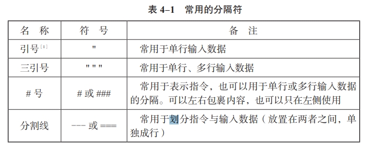 如果我們要分隔提示詞中的不同成分,使用上述符號(hào)可以達(dá)到比較好的效果。經(jīng)過(guò)測(cè)試,如果是多段的文本,增加” ” “會(huì)提升AI大語(yǔ)言模型反饋的準(zhǔn)確性。