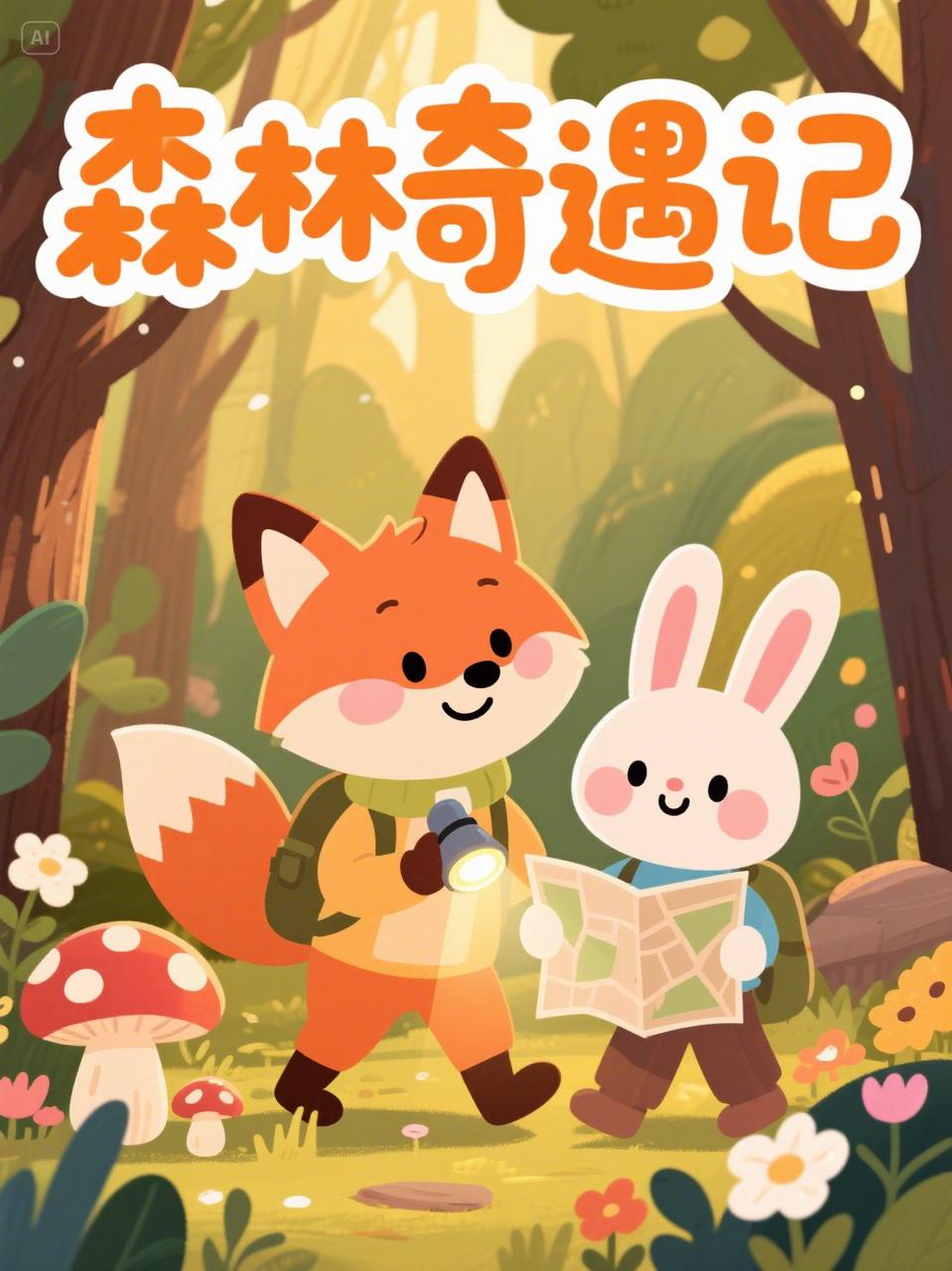 繪本風(fēng)格,卡通小狐貍和兔子在森林探險,他們拿著地圖和小手電筒,周圍有蘑菇和花朵,文字為”森林奇遇記”,位于頂部,字體為可愛體。高飽和度,暖色調(diào),手寫字體,手繪插畫,粗線條,扁平插畫風(fēng)格,黃金時段光線。