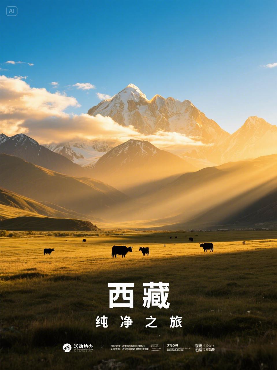 旅游宣傳海報(bào),寫實(shí)攝影,大遠(yuǎn)景仰視西藏雪山,黃金時(shí)段光線,丁達(dá)爾效應(yīng),文字“西藏”,“純凈之旅”用無襯線粗體置于底部