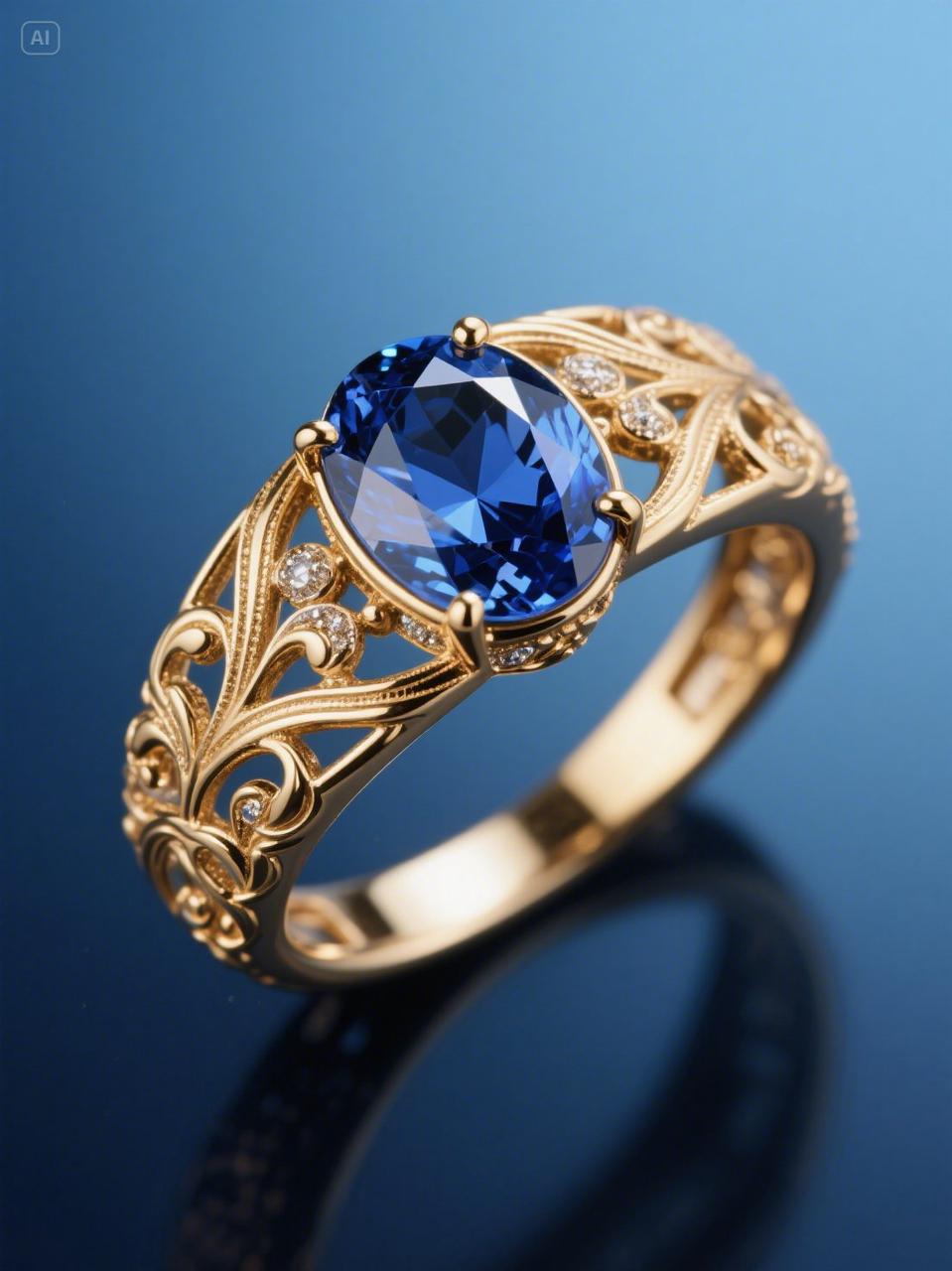 珠寶設(shè)計,黃金戒指鑲嵌橢圓形切割藍(lán)寶石,戒臂雕刻古典藤蔓花紋,微距攝影展現(xiàn)金屬拋光紋理與寶石火彩,深藍(lán)色漸變背景,珠寶攝影,高光反射,焦散效應(yīng),景深控制,HDR渲染