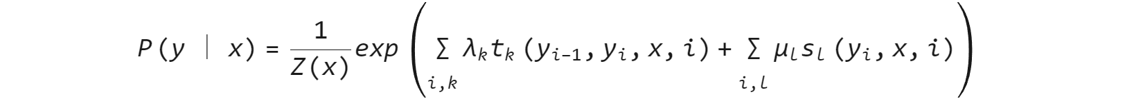 其中,Z(x)是規(guī)范化因子,求和是在所有可能的輸出序列上進行的。t_{k}是定義在邊上的特征函數,稱為轉移特征,依賴于當前和前一個位置。s_{l}是定義在結點上的特征函數,稱為狀態(tài)特征,依賴于當前位置。