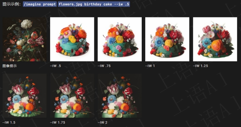 – 在這個(gè)示例中,`Flowers.jpg` 是圖像提示,`Birthday cake` 是文本提示,`–iw 1.5` 表示圖像提示的權(quán)重較高。