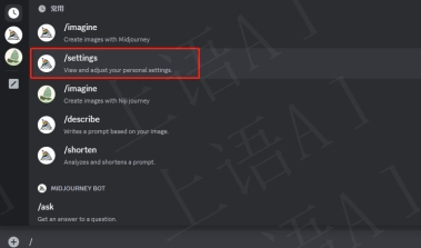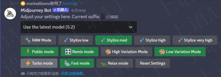 `/settings` 命令為用戶提供了一個便捷的界面,用于調整模型版本、風格化、混合模式、圖像變化等常見選項。