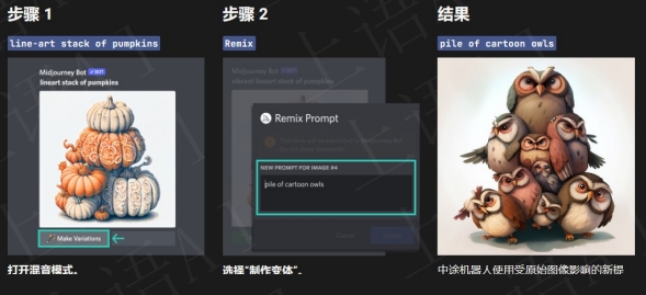 Remix 模式允許用戶在生成圖像變體時修改提示詞、參數、模型版本或縱橫比。