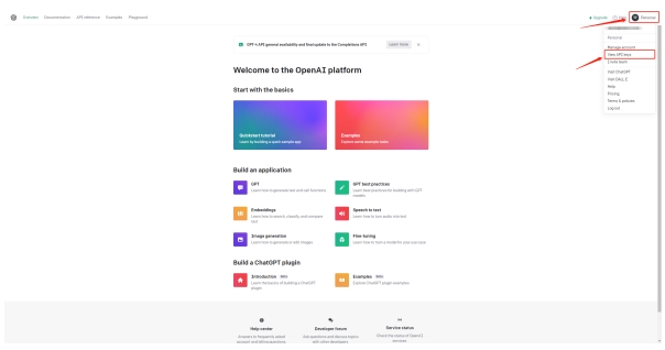 我們選擇 API ,然后點(diǎn)擊右上角的頭像,選擇 View API keys ,如下圖所示: