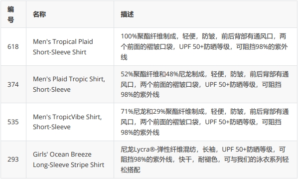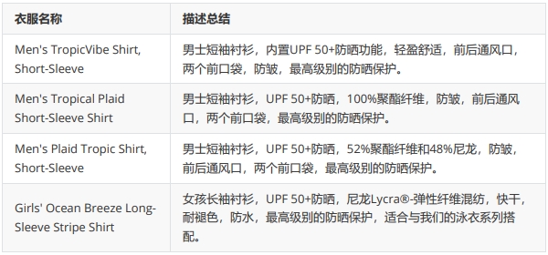 總結(jié):這些襯衫都具有防曬功能,防曬等級為UPF 50+,可阻擋98%的紫外線。它們都是輕便的,防皺的,有前后背部通風(fēng)口和前面的褶皺口袋。其中女孩的長袖條紋襯衫是由尼龍Lycra?-彈性纖維混紡制成,快干,耐褪色,可與泳衣系列輕松搭配。