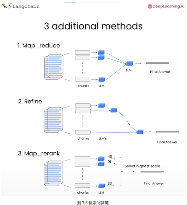 1.Map Reduce: 將所有塊與問題一起傳遞給語言模型,獲取回復(fù),使用另一個語言模型調(diào)用將所有單獨的回復(fù)總結(jié)成最終答案,它可以在任意數(shù)量的文檔上運行。可以并行處理單個問題,同時也需要更多的調(diào)用。它將所有文檔視為獨立的