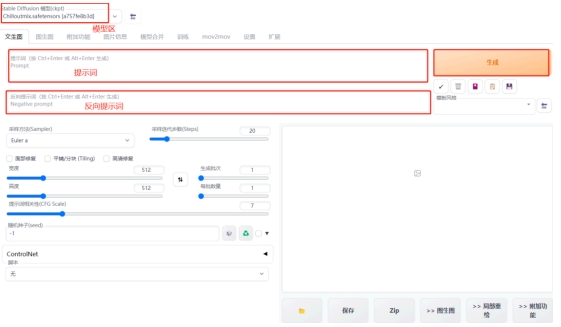 4、下面我們主要講解一下紅框內(nèi)我標(biāo)示出來的幾個區(qū)域,分別是模型區(qū)、提示詞區(qū)、反向提示詞區(qū)。