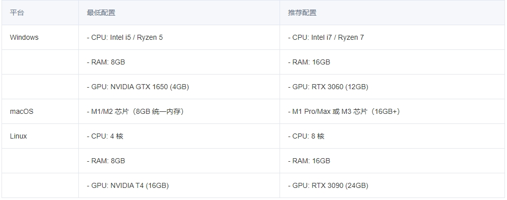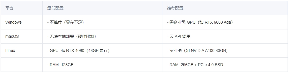 以下按模型規(guī)模和平臺分類,提供 最低配置 和 推薦配置。