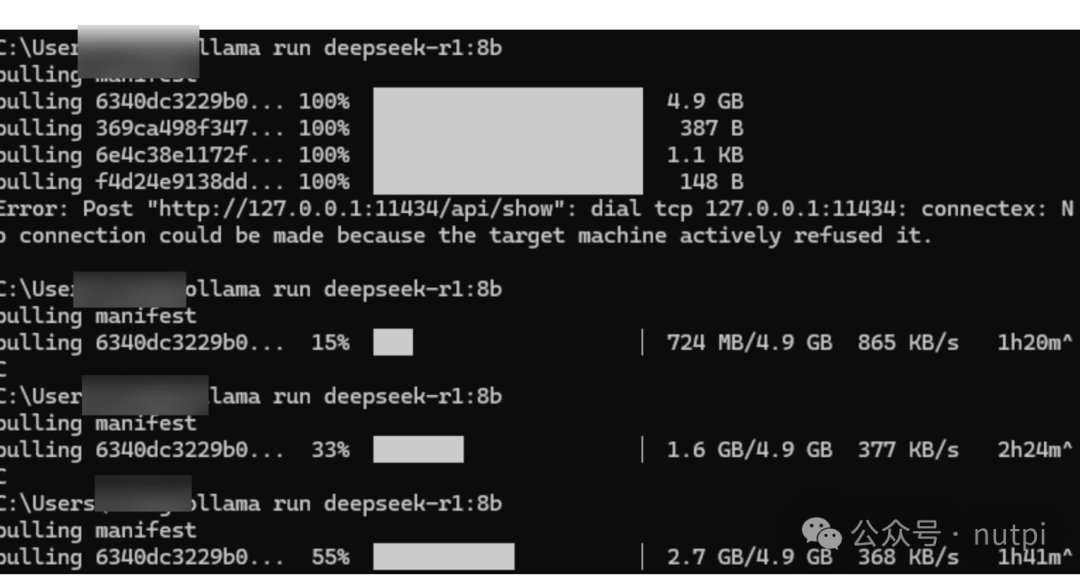 確定適合自己電腦配置的模型版本后,就可以開始下載和運行模型了。打開終端或 CMD 命令窗口,輸入對應的運行指令: