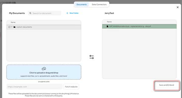 待文檔上傳完畢,點擊 Save and Embed 按鈕,將文檔內(nèi)容轉(zhuǎn)換成向量數(shù)據(jù)并執(zhí)行嵌入操作。
