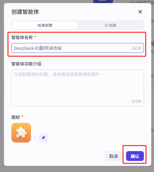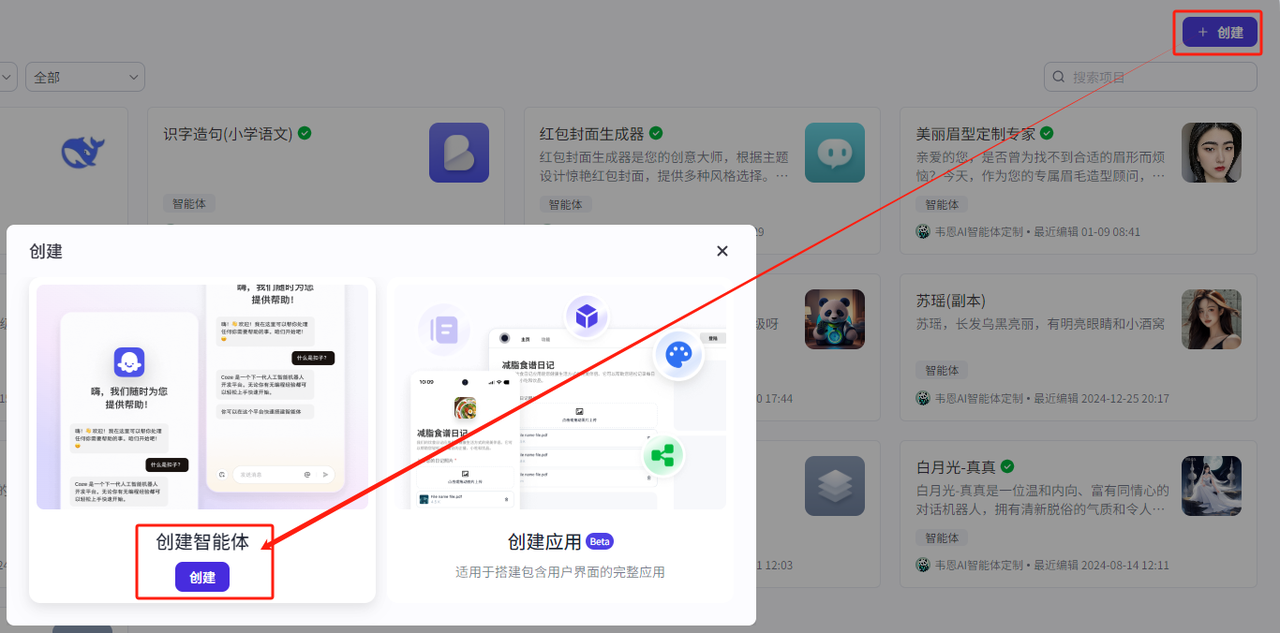 點(diǎn)擊創(chuàng)建,先完成一個(gè)智能體的創(chuàng)建