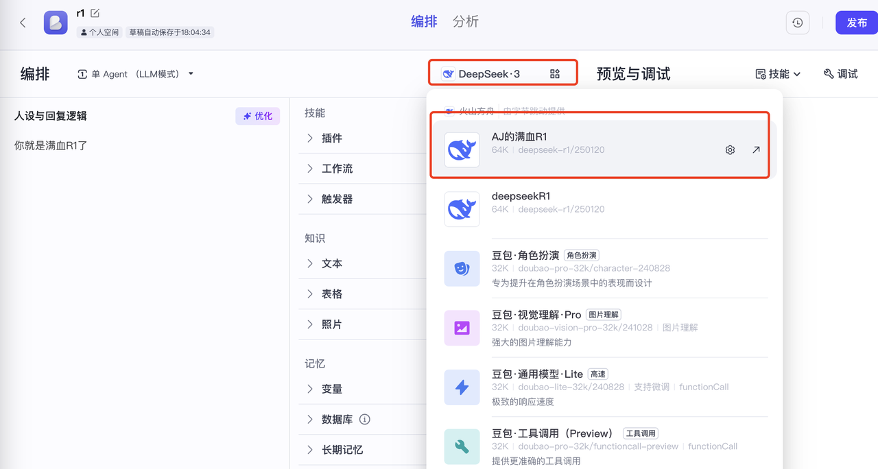 那么直接在Bot編排里就可以直接看到和選擇 創(chuàng)建好的推理模型了