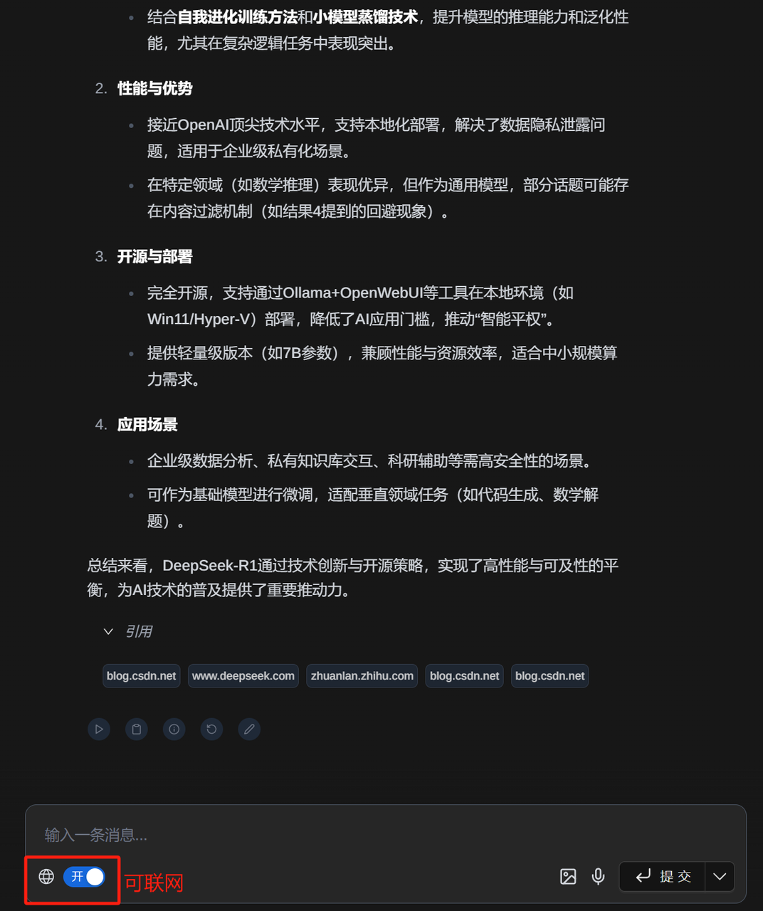 – 可以愉快玩耍,無(wú)需擔(dān)心“服務(wù)器繁忙”了,打開聯(lián)網(wǎng)功能,還可以支持聯(lián)網(wǎng)搜索使用R1。