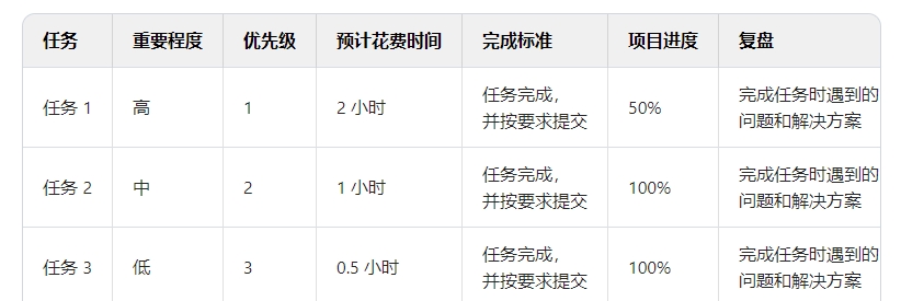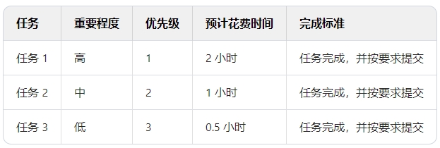 請按照任務(wù)的重要程度、優(yōu)先級、預(yù)計花費時間和完成標(biāo)準(zhǔn)這幾項,幫我生成一份工作計劃,以表格呈現(xiàn)。