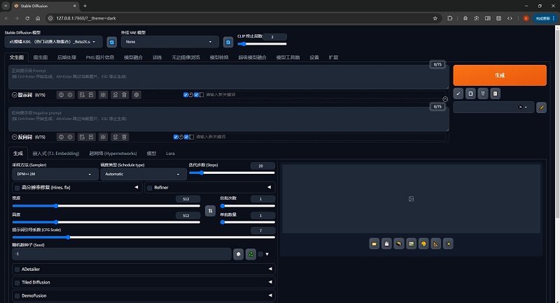 這就是最終的SD-WebUI頁面,我們平時輸入提示詞生圖等操作都在這里進行。到這里部署就已經(jīng)全部完成。